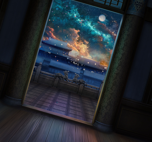 The main series features background art depicting a fictional world inspired by China's Forbidden City. Based on the rough image provided by the director, the artwork creates a symbolic realm where main characters Maomao and Jinshi stand poised on the threshold of their next adventure. The visual expression weaves together diverse imagery—from cosmic scenes and nebulae to fire—enriched by intricate patterns and dragons added during the production process.